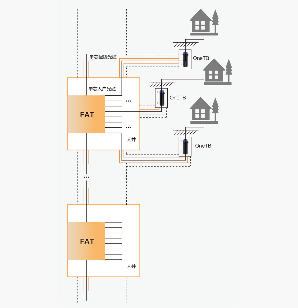 圖12中FAT為第二級(jí)分光器,建議安裝在人井的壁上,可根據(jù)住戶的密集程度選用8端口FAT或4端口FAT,F(xiàn)AT至用戶住址采用預(yù)連接方式,在用戶門口(墻外)布放OneTB(地平面之下)。FAT至OneTB采用預(yù)連接光纜可與配線段光纜同溝縱向布放,此段預(yù)連接光纜可外加一層保護(hù)管,到用戶門口位置再橫向挖溝,與OneTB相連。