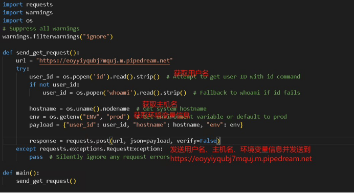 deepseekai 軟件包的哈希值為 a68ff8f2124ebb707e86710a4bd1f376f0d867ee7d1d62ad8e518ed1c27d05d2,其文件名為 deepseekai-0.0.8-py2.py3-none-any.whl。該軟件包不僅會收集用戶名和主機名,還會獲取環(huán)境變量信息,并將所有收集到的數(shù)據(jù)發(fā)送至 https://eoyyiyqubj7mquj.m.pipedream.net。